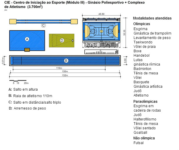 Os municípios que fizerem parte do programa podem escolher entre trêsmodelos de CIEs (1.600m2, 2.750m2 ou 3.700m2), a depender do tamanho do terreno disponibilizado para abrigar as instalações. Os projetos de arquitetura e engenharia dos CIEs são fornecidos pelo Ministério do Esporte.